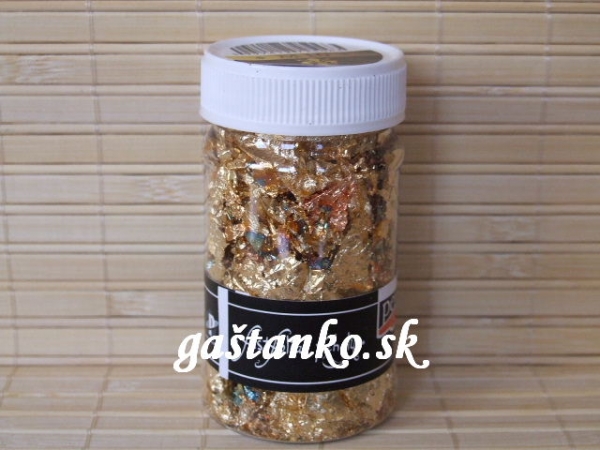Fliačky dymovej fólie rôznych veľkostí. Prevažne zlatá, kombinovaná s troškou medi a modrastých fliačkov. Na dekorovanom predmete vytvoria tenký kovový film. K ich prilepeniu použite lepidlo na dymovú fóliu. (Viac sa dočítate v technikách a v info v rámci kategórie.) 100ml=1g