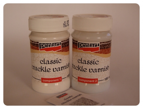 Krakelovací lak na vytvorenie popraskaných povrchov. Kresba praskliniek pripomína jemné popraskanie starého nábytku. Lak je na vodnej báze, po uschnutí vode odolný. Postup: Na už ozdobený predmet nanesieme prvú fázu laku a necháme uschnúť. Potom nanesieme druhú fázu. Táto druhá vrstva začne počas schnutia praskať. Prasklinky zvýrazníme patinou. Objem: 2x100ml.