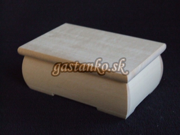 Krabička z masívneho dreva v tvare obdľžnika, s vypuklými stranami a vrchnákom na pánty. Na malých nožičkách. Mimoriadne kvalitne vypracovaná. Rozmery: 120x185x55mm.