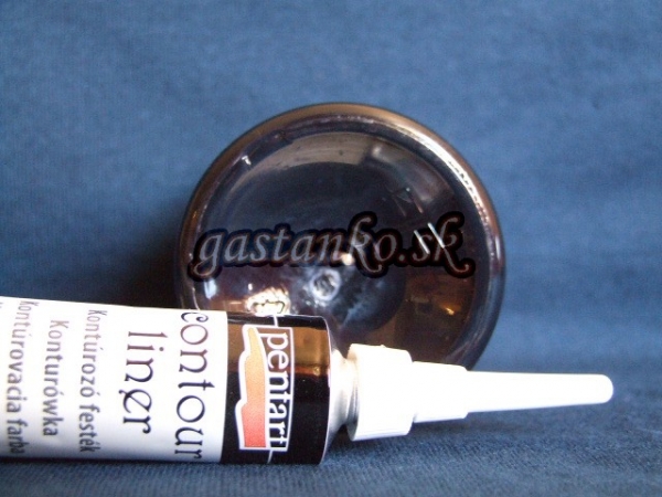 Kontúrovacia akrylová farba v tube s tenučkým aplikátorom, vďaka ktorému môžete kresliť jemné línie: kontúry motívov, ornamenty, ozdoby, písmená,... Vhodná na všetky povrchy - drevo, kartón, sklo, porcelán, textil, plast, polystyrén,... Línia si zachová 3D tvar. Farba je na vodnej báze, netoxická. Objem 20ml. Návod na použitie vrchnáka: tuba má dva vrchnáky. Pri manipulácii stačí stiahnuť nasúvaciu čiapočku. Spodný vrchnák so závitom neodkrúcajte!! Zdobenie skla a keramiky: zdobíme dokonale odmastený povrch. Necháme uschnúť 24-48 hodín. Môžeme zafixovať zapečením v predhriatej rúre pri ca. 130 stupňoch po dobu asi 5 minút (u každého druhu rúry je čas iný). Zdobenie textilu: po zdobení necháme dokonale uschnúť ca.24 hodín. Môžeme zafixovať horúcim fénom, alebo žehlením: kontúra je jemne plastická. Ak chceme plastickosť zachovať, žehlíme z rubu na mäkkej podložke, cez bavlnenú handričku.