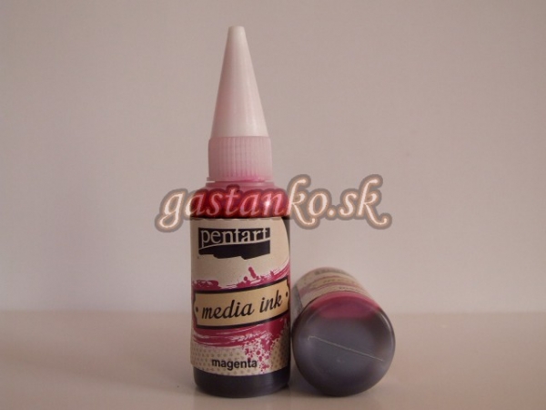 Media atrament. Rýchloschnúci priehľadný atrament na alkoholovej báze. Môžeme ho aplikovať na akýkoľvek povrch. Výborne sa hodí na scrapbooking a zmiešané techniky (mixed media). Na hladkom povrchu (sklo, kov, lesklý papier, plastová fólia, podkladová pasta) bude po uschnutí lesklý s výraznou jasnou farebnosťou. Na poréznom povrchu dosiahneme skôr pastelový odtieň s matným vzhľadom. Jednotlivé odtiene sú navzájom miešateľné. Na zosvetlenie odtieňov a ich vzájomné prechody používame Pentart riedidlo na media atrament. Media Ink neobsahuje kyseliny. Objem 20ml.