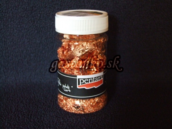 Fliačky dymovej fólie rôznych veľkostí. Medené. Na dekorovanom predmete vytvoria tenký kovový film. K ich prilepeniu použite lepidlo na dymovú fóliu. (Viac sa dočítate v technikách a v info v rámci kategórie.) 100ml=1g