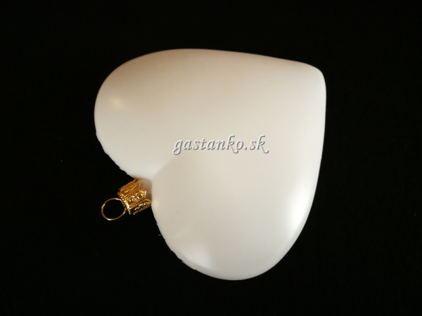 Závesná ozdoba z hladkého bieleho plastu. S ozdobnou objímkou a uškom. Vhodná na zdobenie rôznymi technikami: akrylkami, ryžovým papierom, decoupage papierom, servítkovou technikou, kontúrami, plastickými prvkami, antikovaním,... Výška tela 9cm, celková výška s uškom 10,5cm. Farba ozdobnej objímky s uškom sa môže meniť podľa aktuálnej ponuky dodávateľa (zlatá, strieborná).