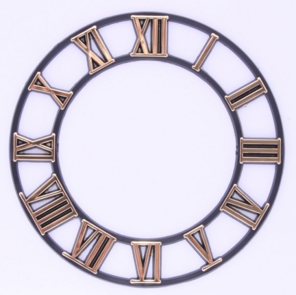Číselný kruh na hodiny. Kruh má vonkajší priemer 15cm, vnútorný priemer 10cm. Číslice sú rímske, antické zlaté s čiernym podkladom. Výška číslic 23mm. Plastové, samolepiace, 3D.