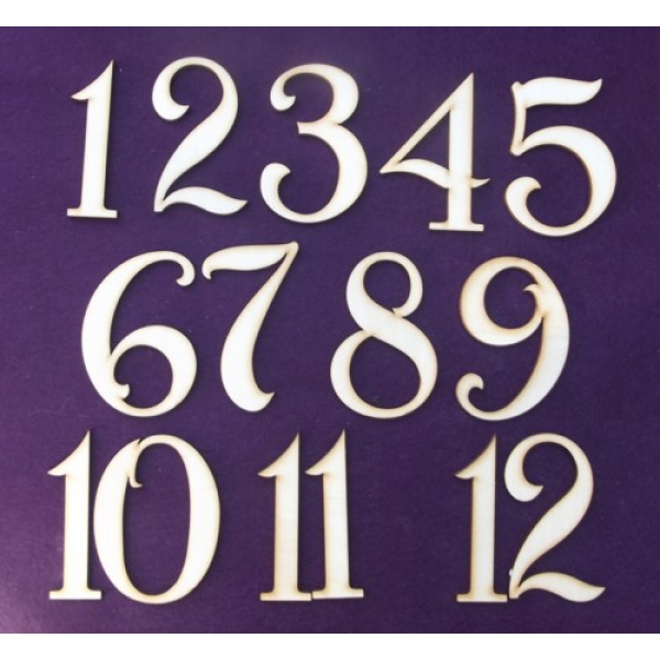 Čísla na hodiny. Set obsahuje číslice 1 až 12. Výška číslic 4cm. Vyrezané laserom z kvalitnej preglejky 3mm.
