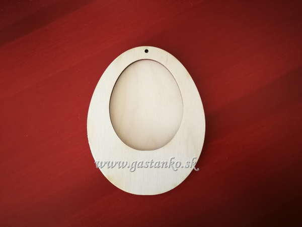 Drevené vajíčko - laserový výrez. Je 2-vrstvové: zadná vrstva = plné vajíčko, predná vrstva = rámček, ktorý sa smerom dolu rozširuje. Vyrobené z kvalitnej preglejky hr.3mm. Rozmery 9x12cm. Cena za 1set (vajíčko+rámček).