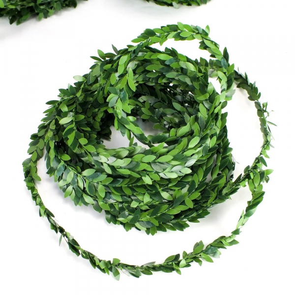 Krásny drobnolistý vavrín v girlande na tenkom drôtiku. Skvelý doplnok na jarné či letné mixed media tvorenie. Lístky majú dĺžku 15mm a sú z jednej strany svetlejšie zelené, z druhej tmavé zelené. Celková dĺžka girlandy je 7,5metra. Materiál: textília s poplastovaným povrchom.