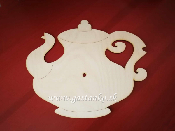 Drevené hodiny v tvare elegantného čajníka. Rozmery ca. 30x25cm. Vyrobené z kvalitnej preglejky hr.3mm. Tento produkt sme pre Vás navrhli my.