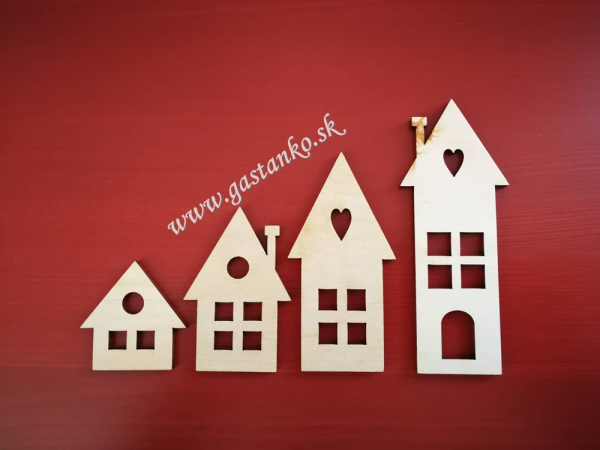 Drevená ozdôbka - laserový výrez. Kolekcia 4 rôznych domčekov s výškou 4cm, 6cm, 8cm a 10cm. Veľkostne sa ideálne hodia na adventné svietničky z našej ponuky. Rovnako pekne vyniknú aj v iných, a nielen adventných kompozíciách.