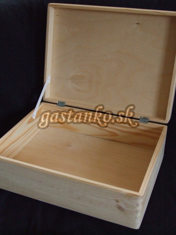 Drevený kufrík zo smrekového masívu. S vrchnákom na pánty. Bez postranných otvorov. Mimoriadne precízne vypracovaný, soft hrany. Rozmery: 300x400x130mm. Bez nožičiek.