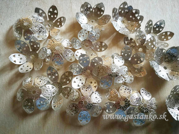Kovové ozdobné kvietky, ohýbateľné - farba jasná strieborná. Priemer: 27mm. Balenie obsahuje 10ks.