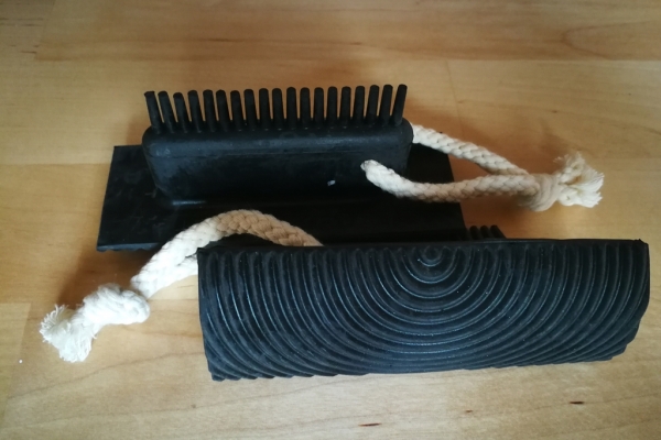 Gumená pomôcka na vytváranie imitácie štruktúry skutočného dreva. Na dekorovaný povrch nanesieme akrylovú farbu v dvoch odtieňoch a ešte kým je vlhká, ťaháme po povrchu toto náradie a pritom ho "hojdáme". Alebo na dekorovaný povrch nanesieme v tenkej vrstve niektorú reliéfnu pastu z našej ponuky (napr. podkladovú pastu, modelovaciu pastu, modelovaciu pastu Light, Soft gesso a pod.). Reliéf v tvare letokruhov, ktorý je na žilkovacom drievku, vytvorí na dekorovanom povrchu skutočné žilkovanie živého dreva. Druhým koncom náradia viete vytvárať reliéfne ryhy. Po použití ihneď očistite mydlovou vodou a kefkou. Šírka náradia: 97mm. Cena za 1ks.