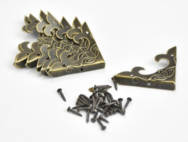 Kovové ochranné a ozdobné rohy na krabičky. S pekným vzorovaním. Farba antik bronz. Balenie obsahuje 8ks rohov plus klinčeky na ich upevnenie. Rozmery rohov: 30x30x5mm.