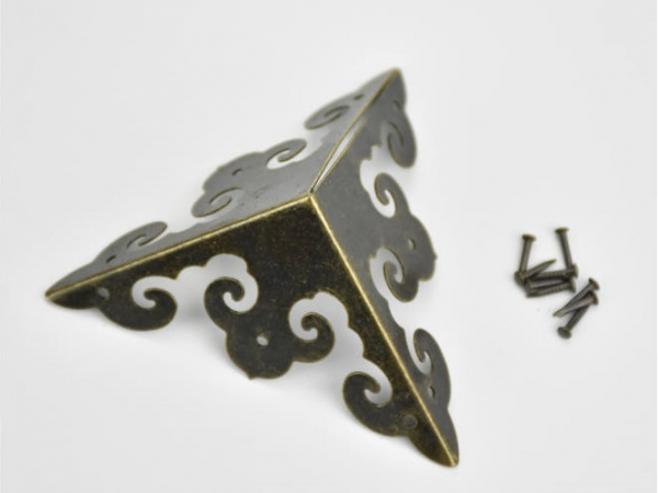 Kovové ochranné a ozdobné rohy na veľké krabice. S pekným vzorovaním. Farba antik bronz. Balenie obsahuje 4 kusy rohov plus klinčeky na ich upevnenie. Rozmery rohov: 48x48mm.