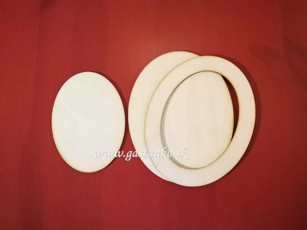 Drevená oválna doštička s rámčekom - laserový výrez. Rozmery zadnej doštičky: 130x165mm. Vnútorný otvor v rámčeku: 90x125mm. Vyrobené z kvalitnej preglejky, hr.3mm. Gratis: doštička elipsa s rozmermi 90x125mm.