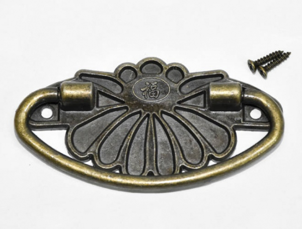 Kovová ozdobná úchytka s bohatým vzorovaním. Farba antik bronz. Dľžka 70mm. Montuje sa na zásuvky, bedničky alebo na vrchnáky krabičiek. Cena je vrátane 2 skrutiek.
