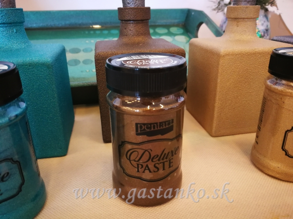 Úžasná pasta, ktorá právom nesie vo svojom názve slovo "Deluxe", pretože je naozaj delikátna, luxusná! Očarí vás farebná škála, v ktorej vám ju ponúkame. Je to pasta s decentným leskom a veľmi jemnou zrnitosťou, vďaka ktorej vytvára veľmi jemne drsný povrch. Obsahuje drobulinké trblietky, ktoré sa jemne lesknú v slnečnom svite. Vďaka svojej krémovitej konzistencii sa vynikajúco rozotiera a na dekorovaný povrch ju môžete nanášať štetinovým štetcom, tupovacím štetcom, špachtľou. Je výborne šablónovateľná, aj v kombinácii s 3D šablónami v hrubších vrstvách. Celý výsledný efekt je mimoriadne elegantný. Pasta je po uschnutí brúsiteľná: jemným obrúsením vznikne zaujímavý zodratý efekt.