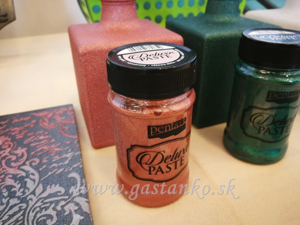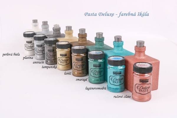 Úžasná pasta, ktorá právom nesie vo svojom názve slovo "Deluxe", pretože je naozaj delikátna, luxusná! Očarí vás farebná škála, v ktorej vám ju ponúkame. Je to pasta s decentným leskom a veľmi jemnou zrnitosťou, vďaka ktorej vytvára veľmi jemne drsný povrch. Obsahuje drobulinké trblietky, ktoré sa jemne lesknú v slnečnom svite. Vďaka svojej krémovitej konzistencii sa vynikajúco rozotiera a na dekorovaný povrch ju môžete nanášať štetinovým štetcom, tupovacím štetcom, špachtľou. Je výborne šablónovateľná, aj v kombinácii s 3D šablónami v hrubších vrstvách. Celý výsledný efekt je mimoriadne elegantný. Pasta je po uschnutí brúsiteľná: jemným obrúsením vznikne zaujímavý zodratý efekt.