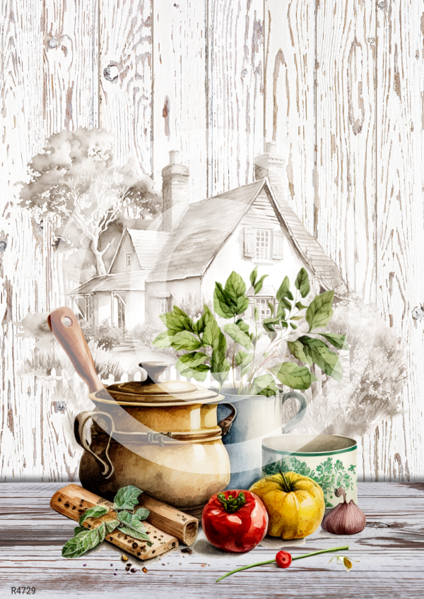 RP Rustikálna kuchyňa - zátišie s domčekom v pozadíRP Rustikálna kuchyňa - zátišie s domčekom v pozadí