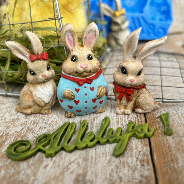 Rozmery hotových motívov: veľký zajačik 30x51x11mm, malí zajkovia 27x48x9mm, nápis 66x26x2mm