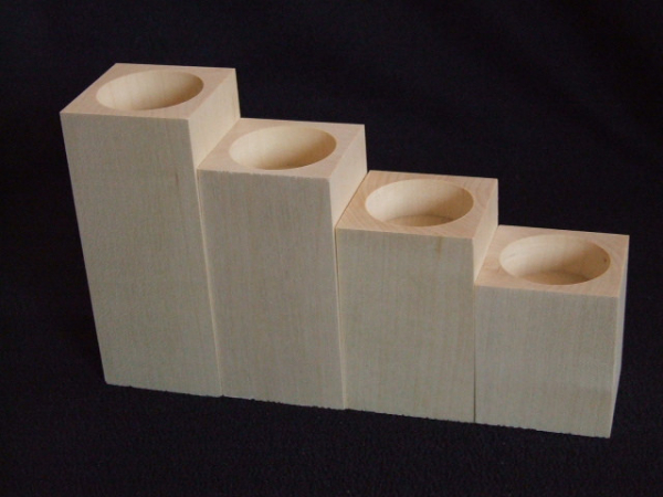 Kolekcia štyroch hranatých svietničkov na čajové sviečky vyrobená z bukového dreva. Výška svietničkov: 6,8,10 a 12cm. Pôdorys každého svietnička je 5x5cm. Cena za celý set. (Svietničky sú samostatné, nie sú spojené. Len na fotke sú vedľa seba.)