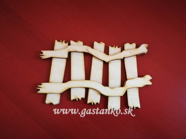 Drevený plot z vyštrbených latiek - laserový výrez. Set sa skladá zo samotného plota a dvoch spojovacích latiek. Vyrobený z kvalitnej preglejky hr.3mm. Rozmery: 6x9,5cm.