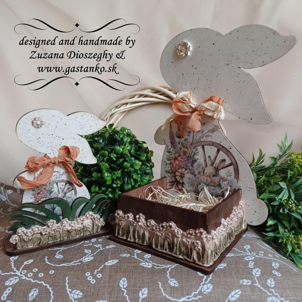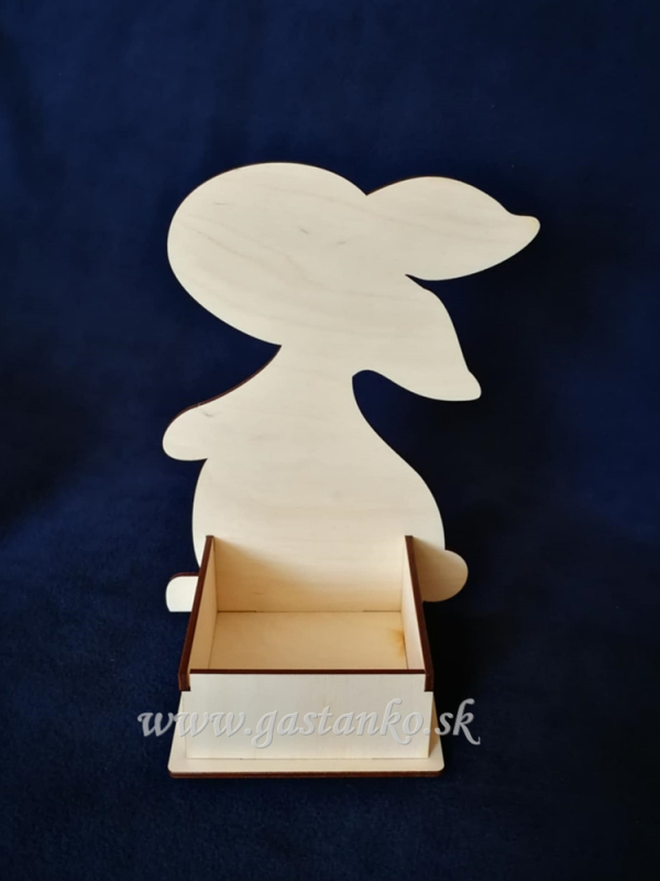 Drevený zásobník na všeličo. Zadnú stranu tvorí postava zajačika a pred ním sa nachádza ohrádka, ktorá môže slúžiť ako úložisko na soľničky, koreničky, oleje a iné veci, ktoré patria k stolovaniu. Môže však slúžiť aj ako milá jarná dekorácia: ohrádka je svojimi rozmermi ideálna napríklad ako hniezdo na polystyrénové či plastové vajíčko veľkosti 12cm. Zásobník je vyrobený z kvalitnej preglejky hr.5mm. Výška zajačika je 25cm. Vnútorné rozmery ohrádky: 10x10x5cm.